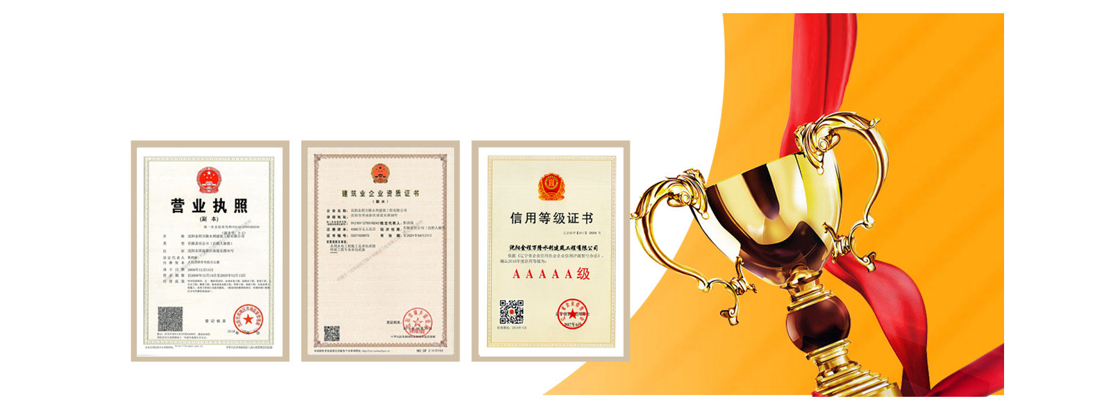 我公司先后受到遼寧省建筑業(yè)協(xié)會(huì)的好評(píng),遼寧省及沈陽市工商局頒發(fā)的重合同守信譽(yù)企業(yè)稱號(hào),勞動(dòng)保障監(jiān)察書面誠(chéng)信等級(jí)A,信用遼寧網(wǎng)站公示AAA等級(jí),信用沈陽網(wǎng)站公示AAA等級(jí),水利安全生產(chǎn)標(biāo)準(zhǔn)化二級(jí)單位,中國(guó)水利工程協(xié)會(huì)信用AAA等級(jí),